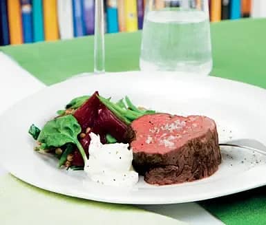 Helstekt oxfilé med ljummen rödbetssallad och getostcrème