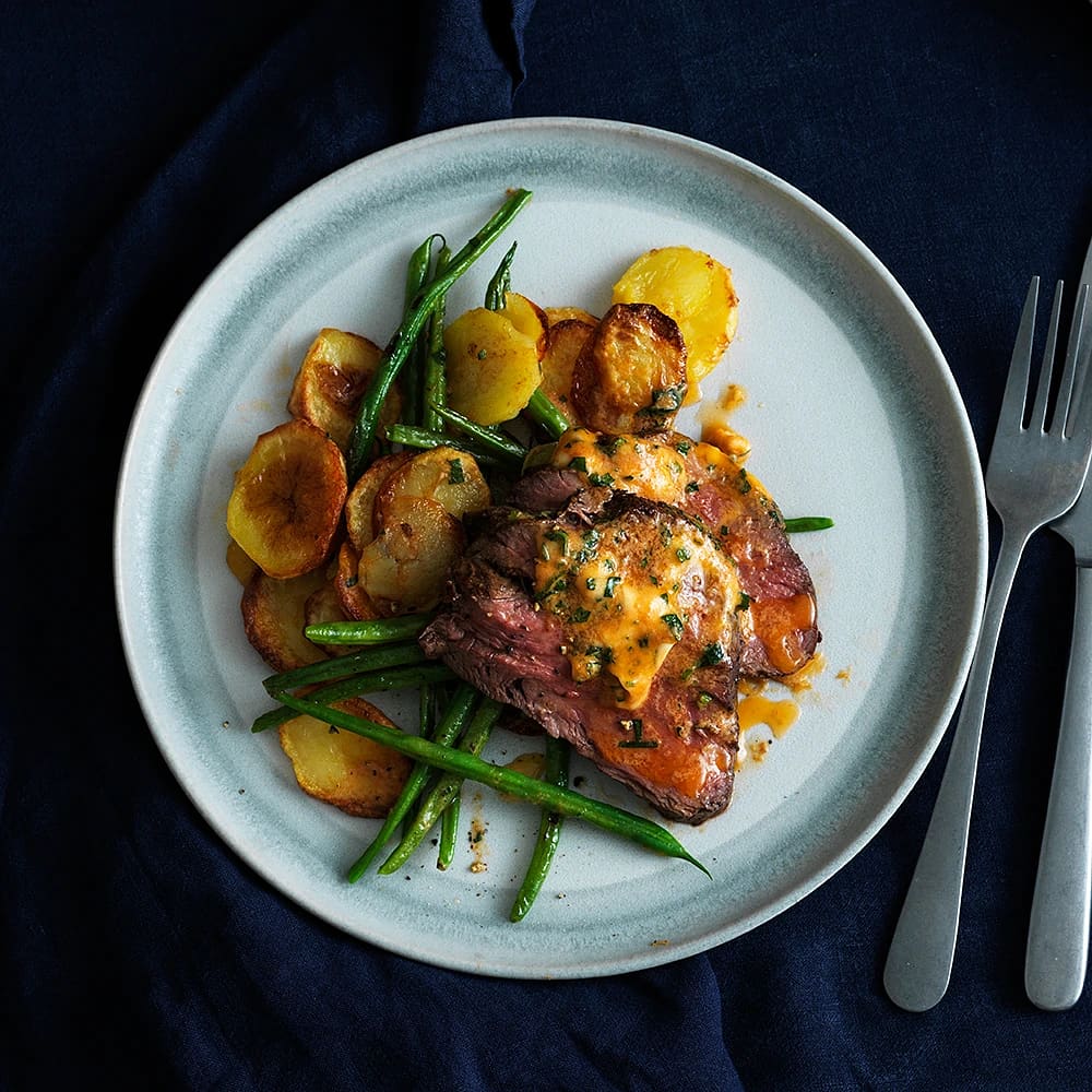 Stekt oxfilé med pommes, ört- och dijonsmör samt ljummen sallad