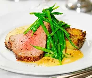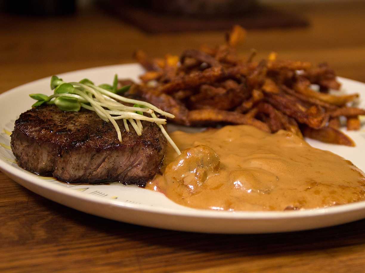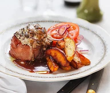 Oxfilé med potatisros och grönpeppar- och sherrysås