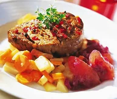 Konjaksflamberad oxfilé med rotsakslåda och grönpepparsås