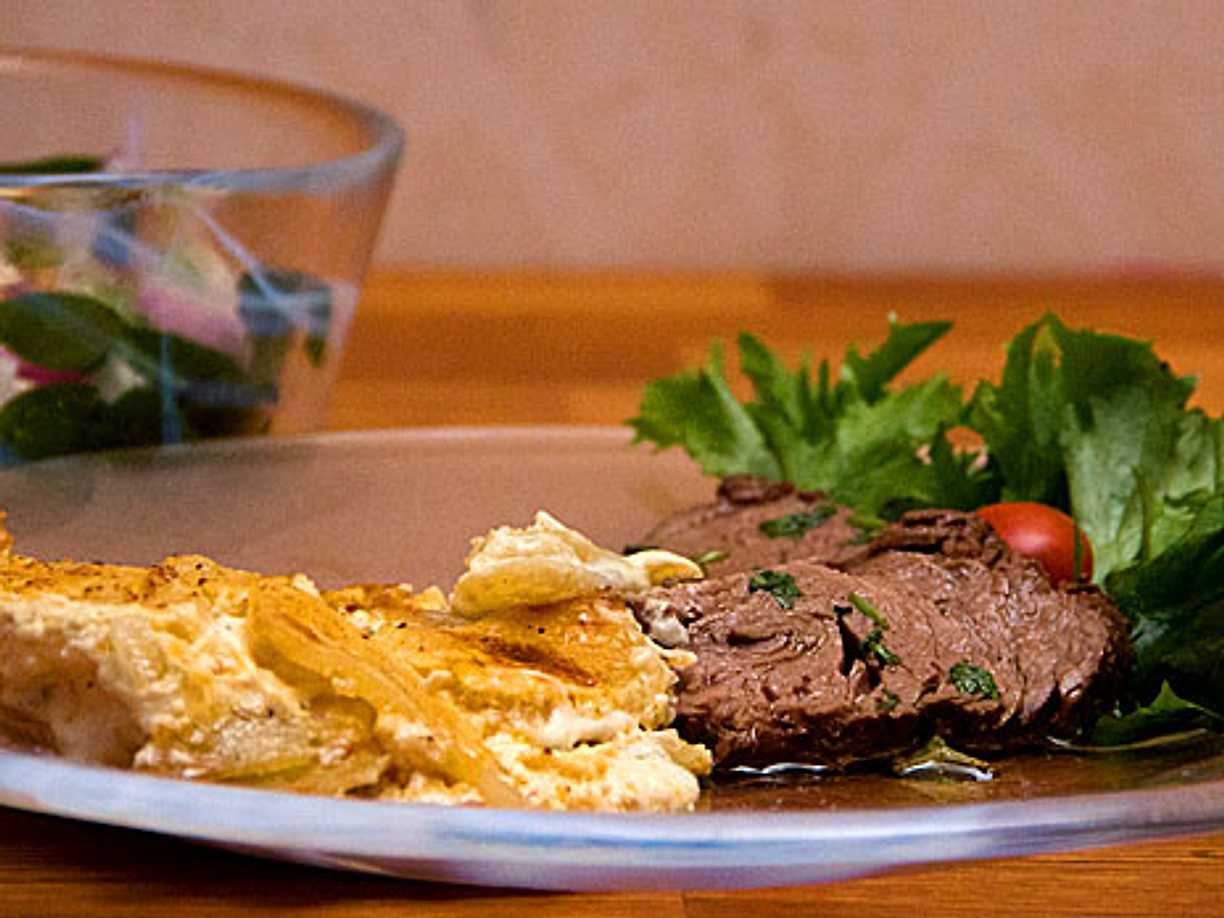 Helstekt oxfilé med rödvinssås och potatisgratäng