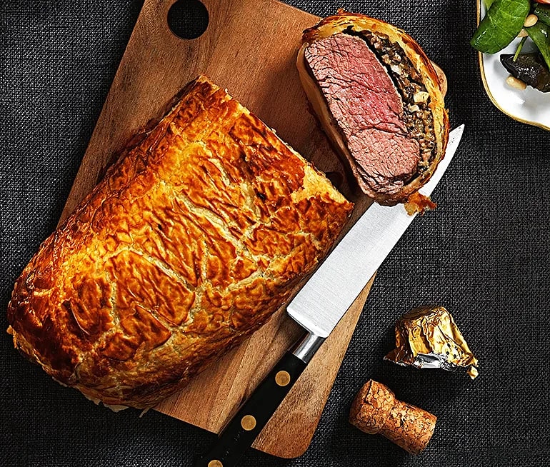 Helstekt vitlöksspäckad oxfilé på potatisbädd