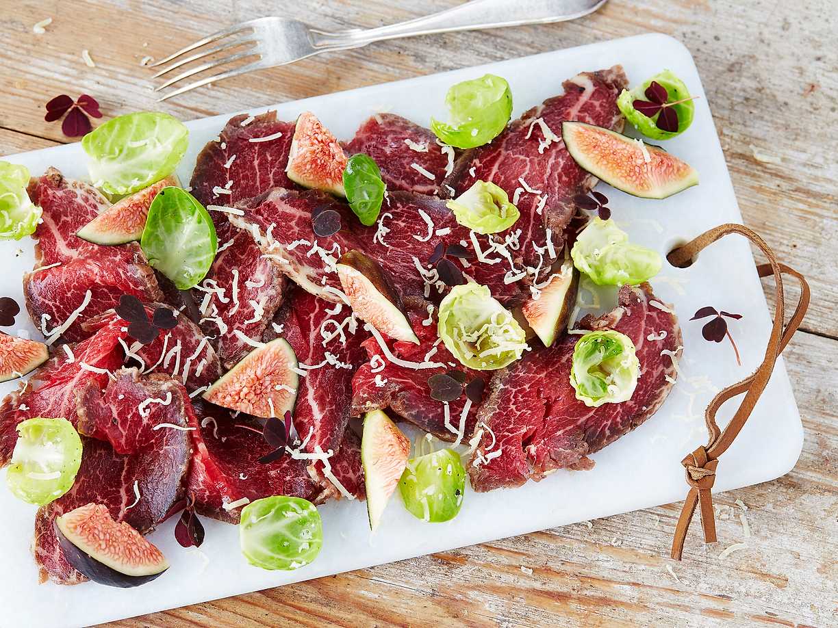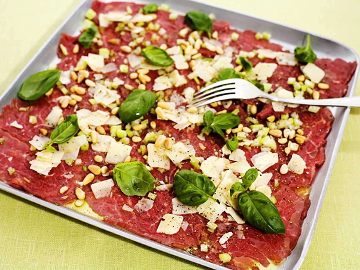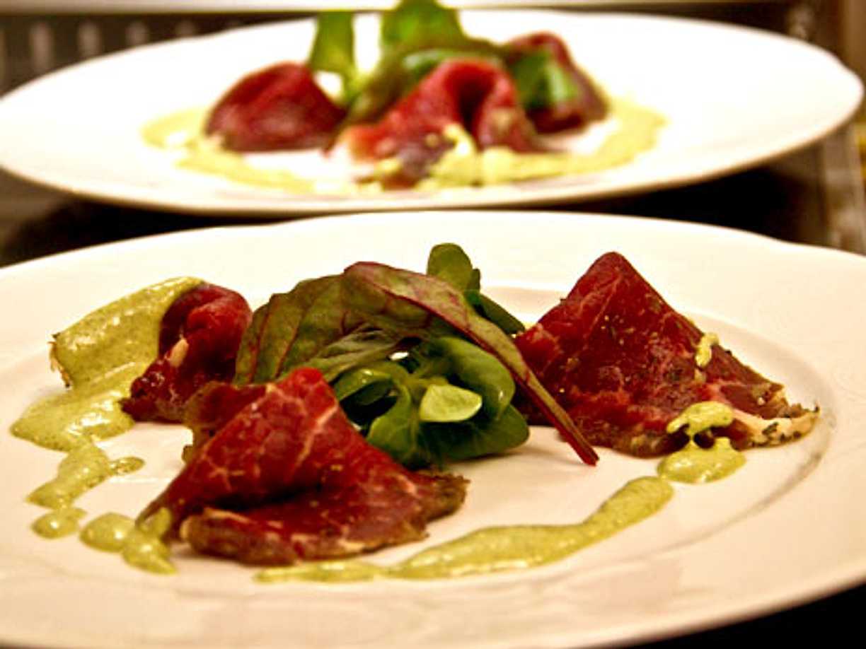 Carpaccio på oxfilé med tryffelolja och sallad på kronärtskocka, rostade pinjenötter och parmesan