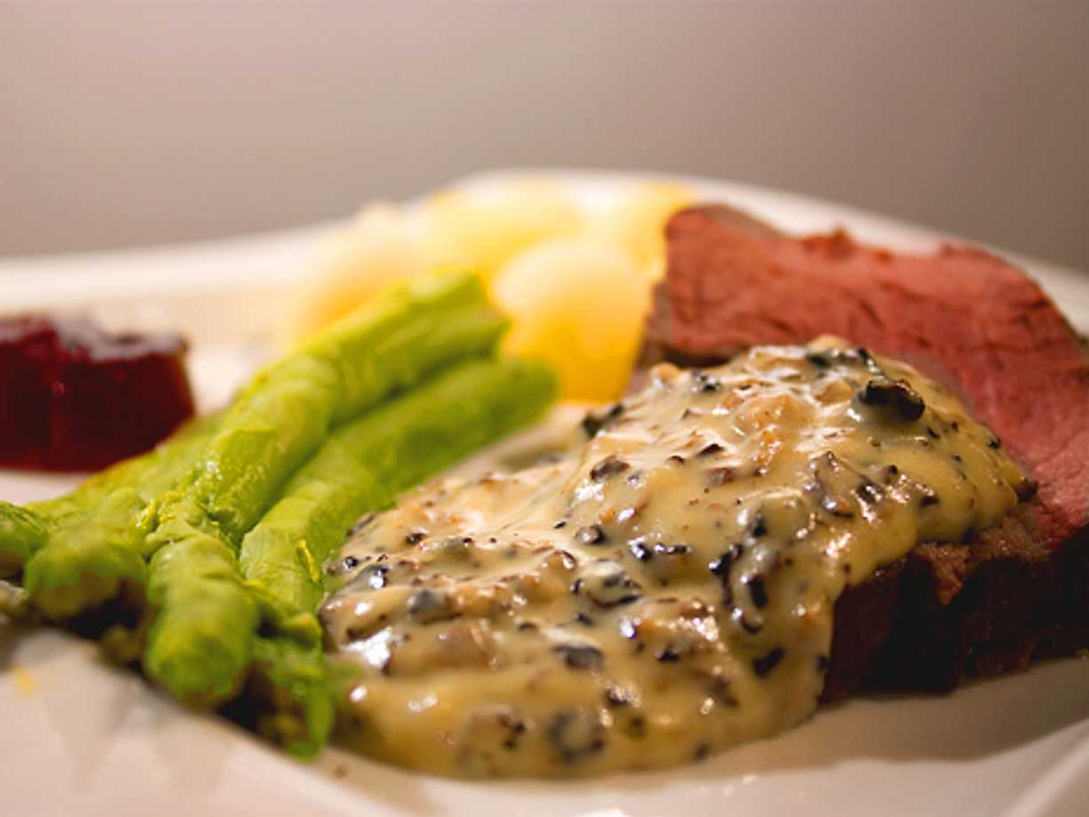 Oxfilé med Västerbottensduchesse, samt flamberad grönpepparsås