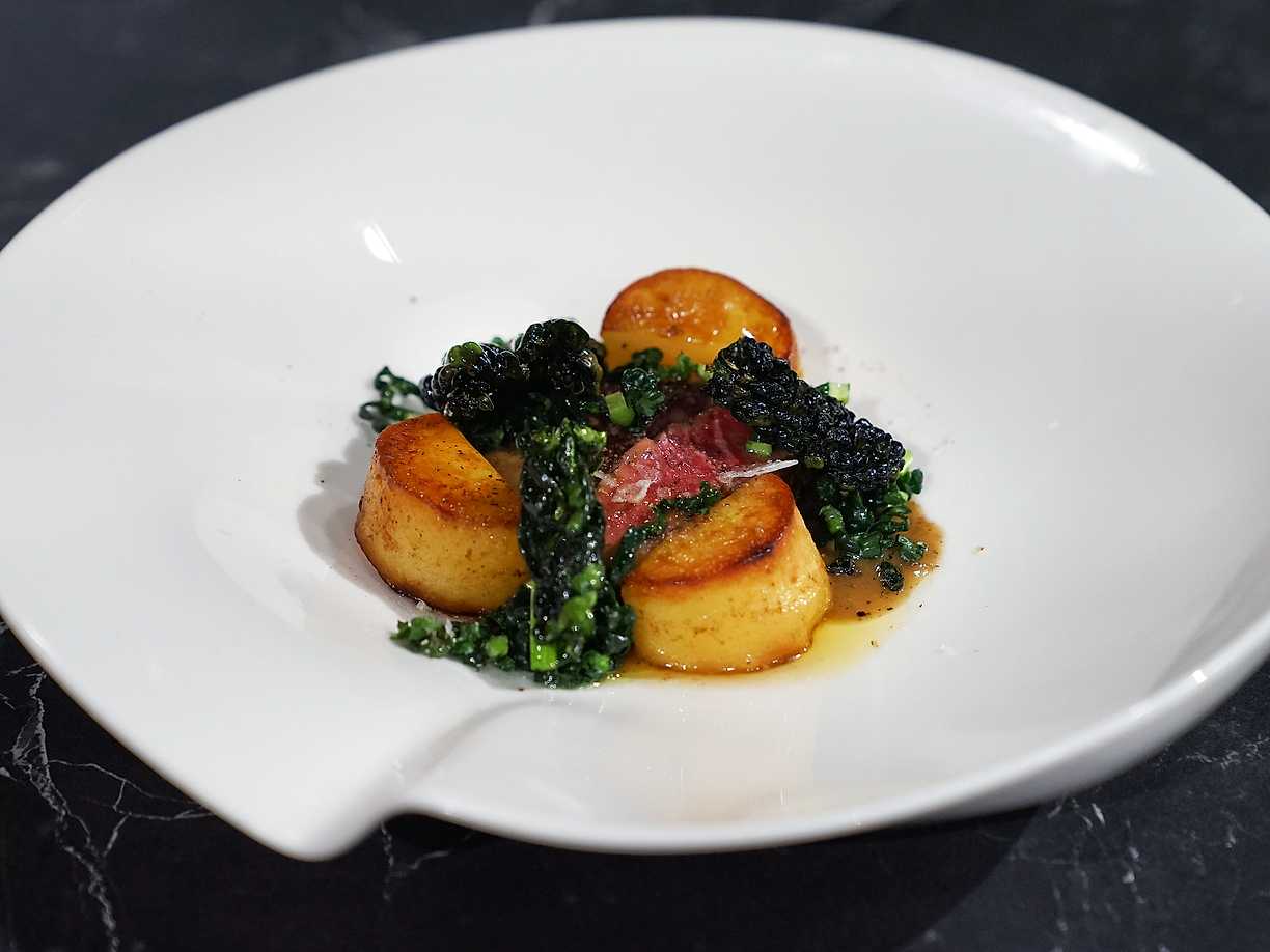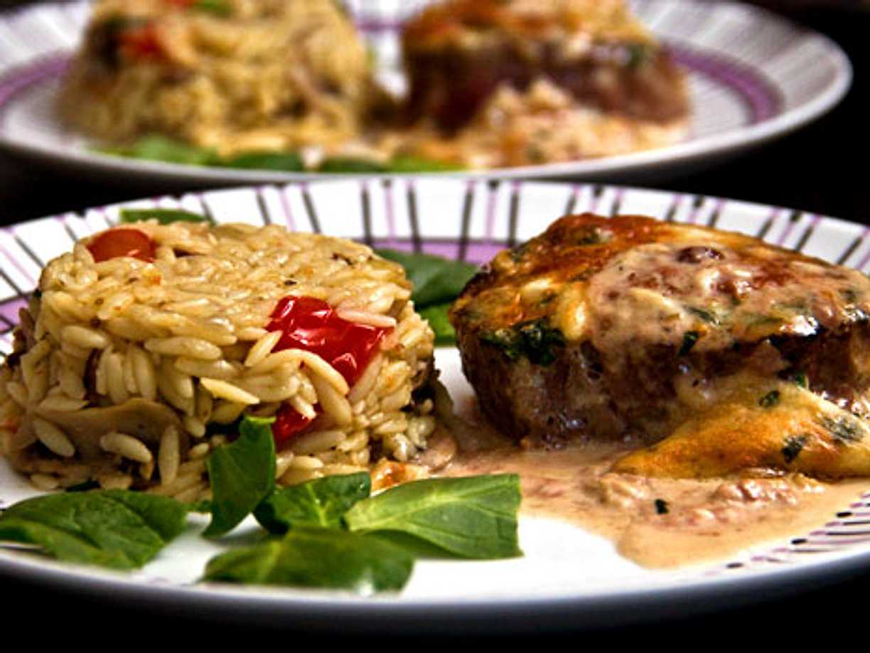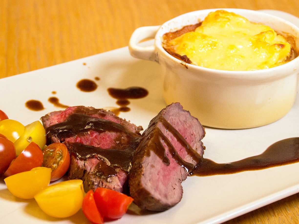 Oxfilé och gratinerat basilikamos, serveras med balsamicosås