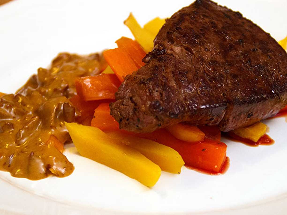 Pepparstekt oxfilé med schalottenlökssabayon och syltade tomater