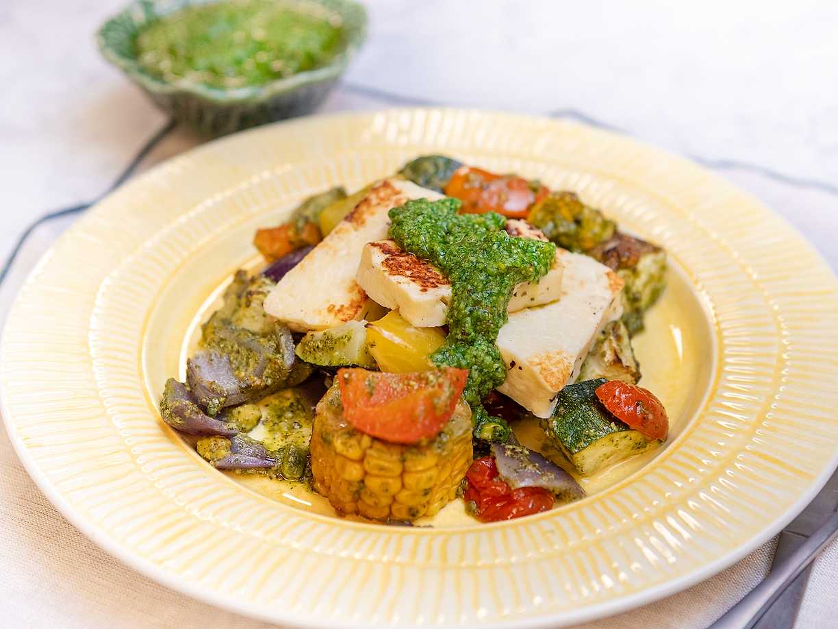 Halloumi på plåt med basilika- och vitlöksyoghurt