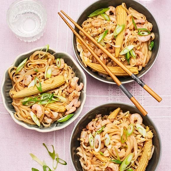 Pad thai med räkor och minimajs