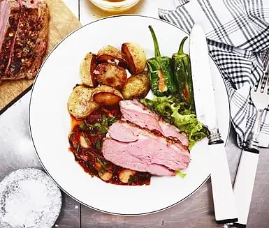 Lammrostbiff med scamorzafylld pimiento de padron