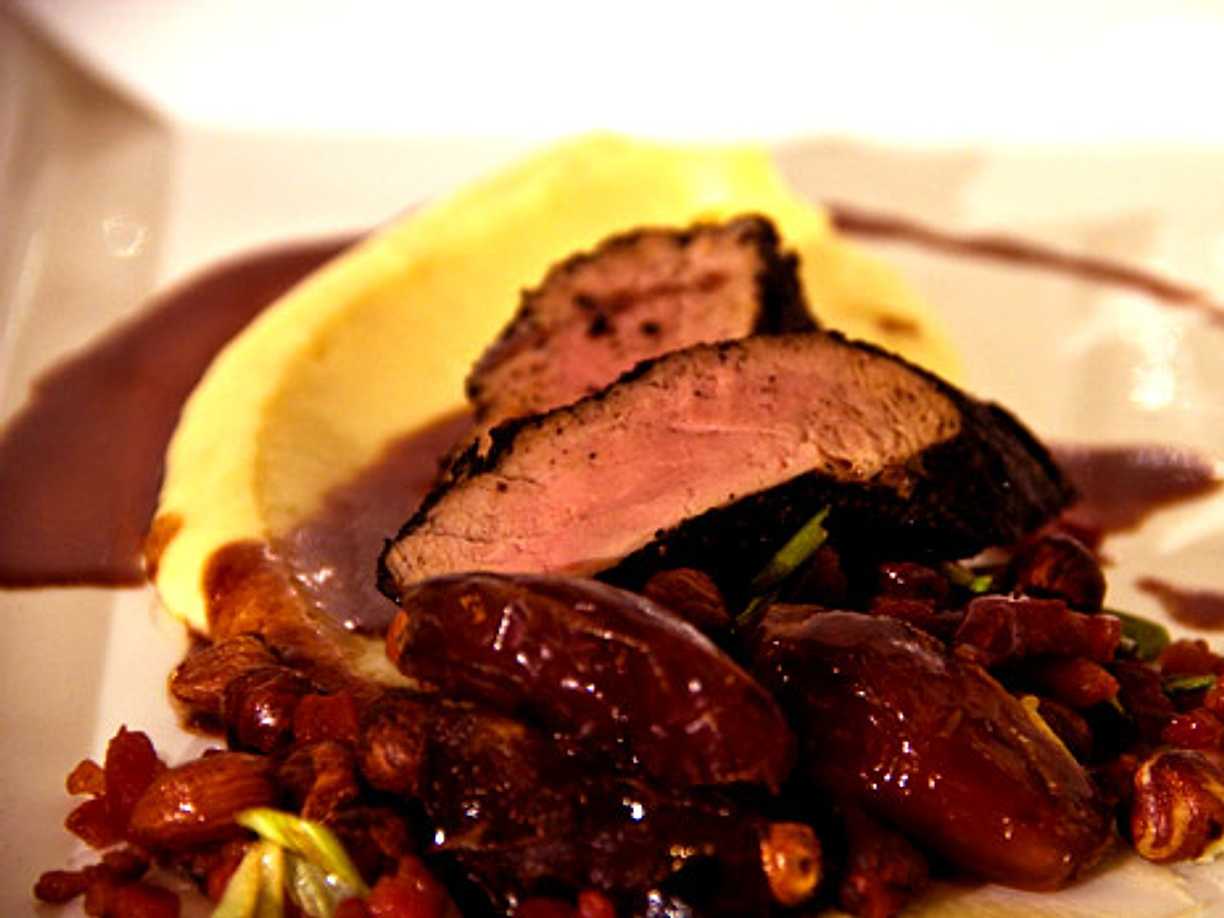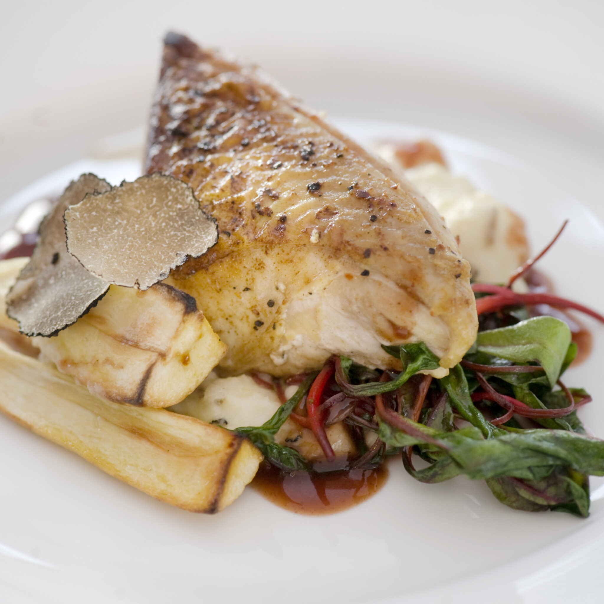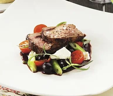 Älgryggbiff med trattkantarellsås, serveras med potatis- och palsternackspuré