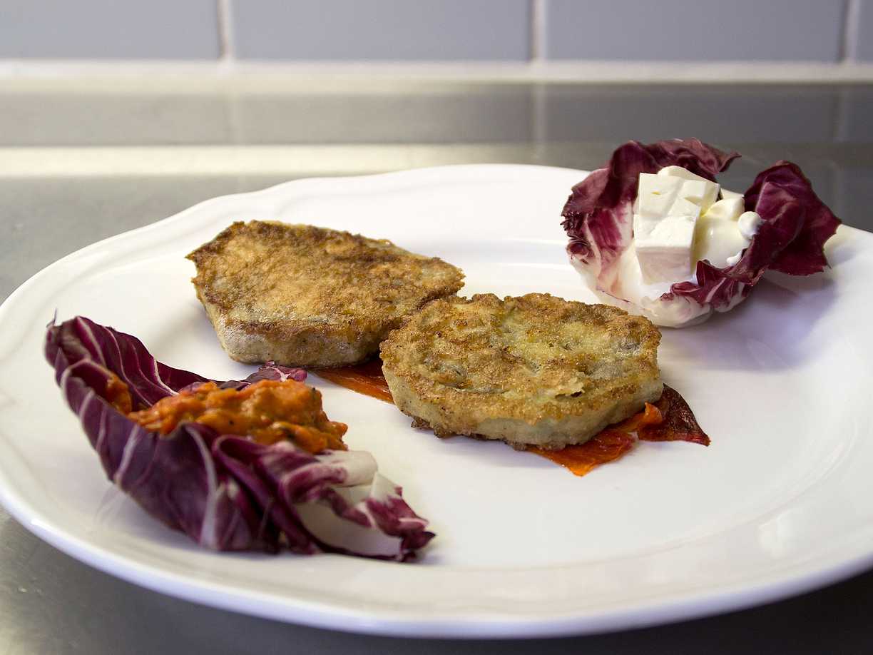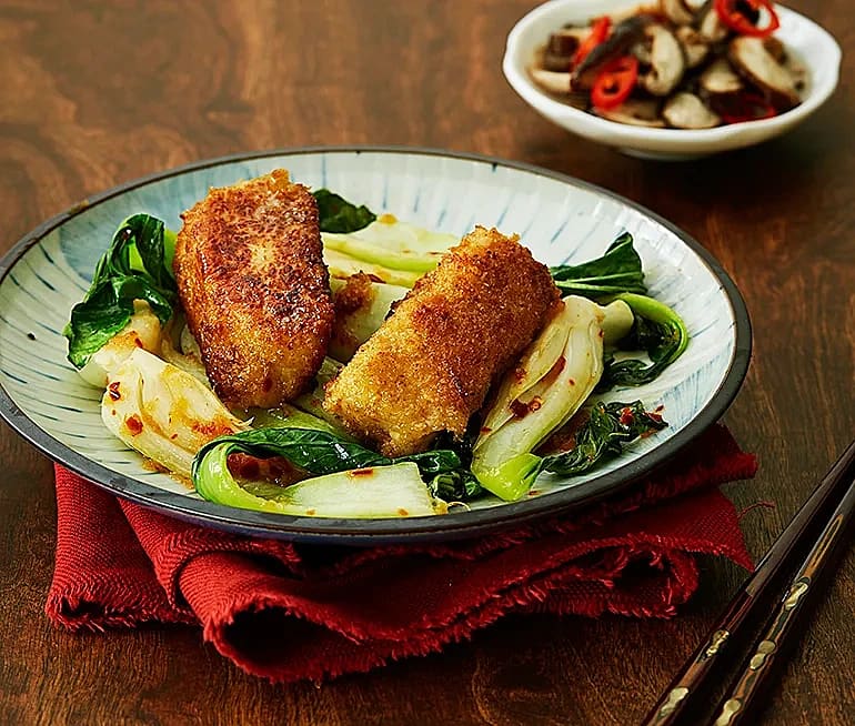 Panerad torskrygg med sötsyrlig pak choi och inlagd svamp