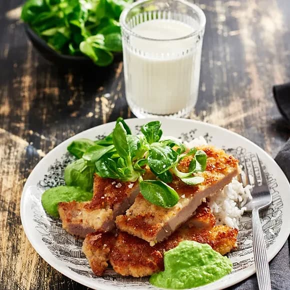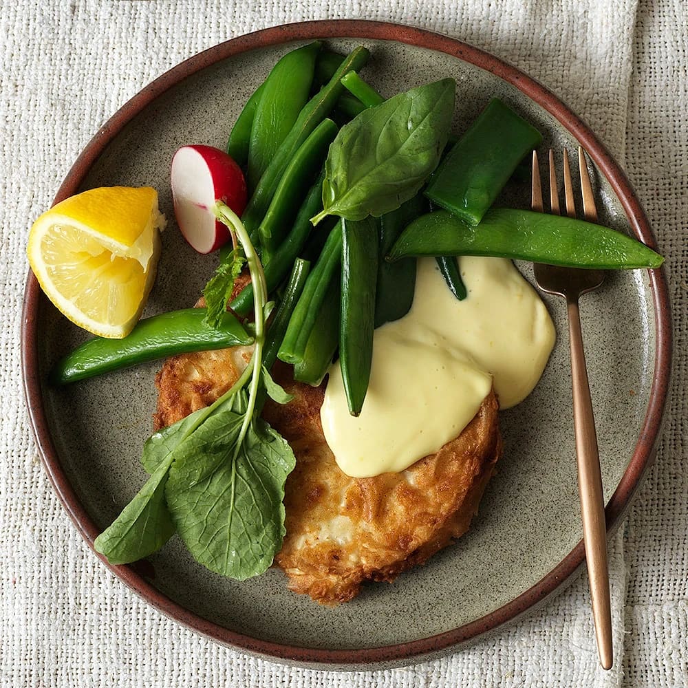 Panerad torsk med dijonmajonnäs och gröna grönsaker