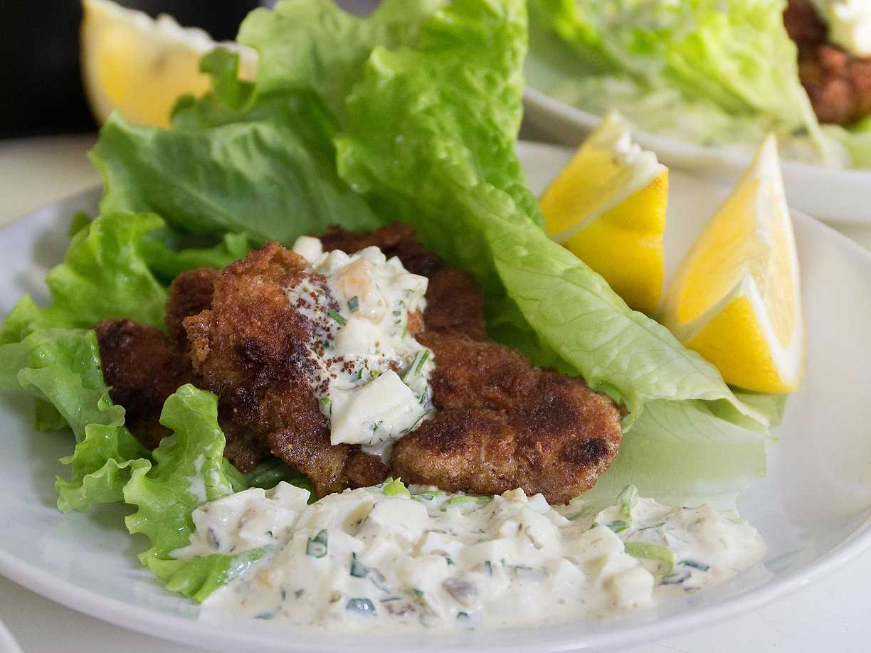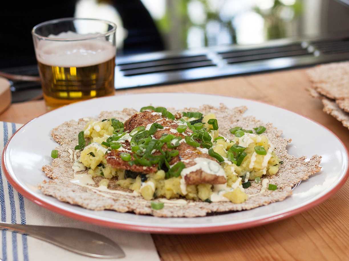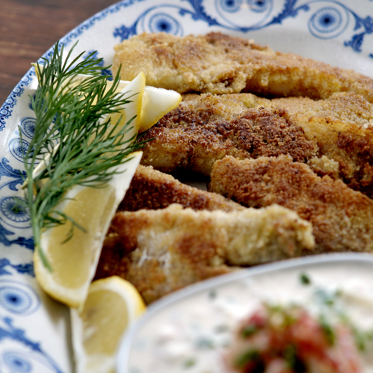 Panerad smörstekt abborre på hemgjort knäckebröd