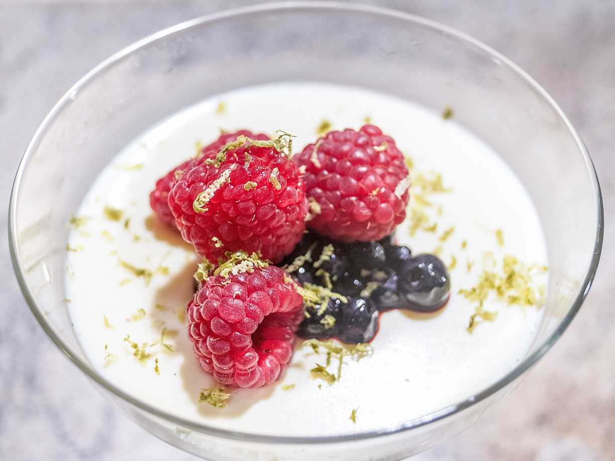 Pannacotta med espresso, lättvispad grädde och björnbär