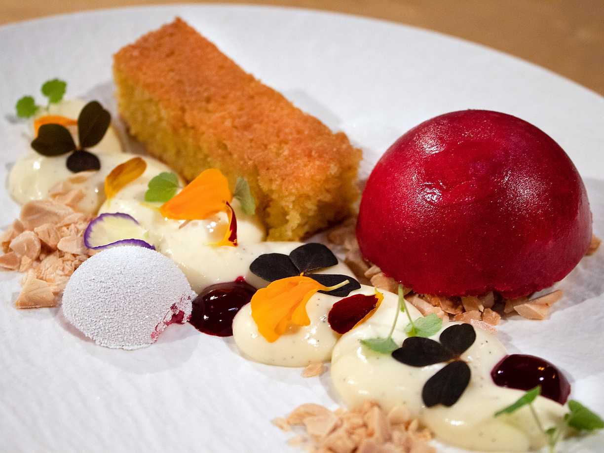 Saffranskaka med vispad pannacotta och salmbärssorbet