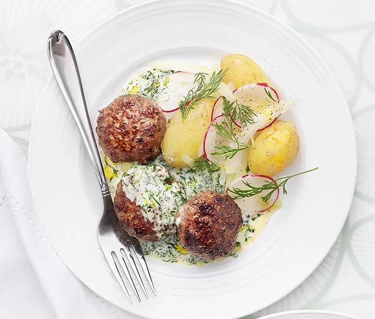 Pannbiffar med rädisor och dillsås