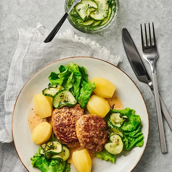 Pannbiff med tzatziki och delikatesspotatis