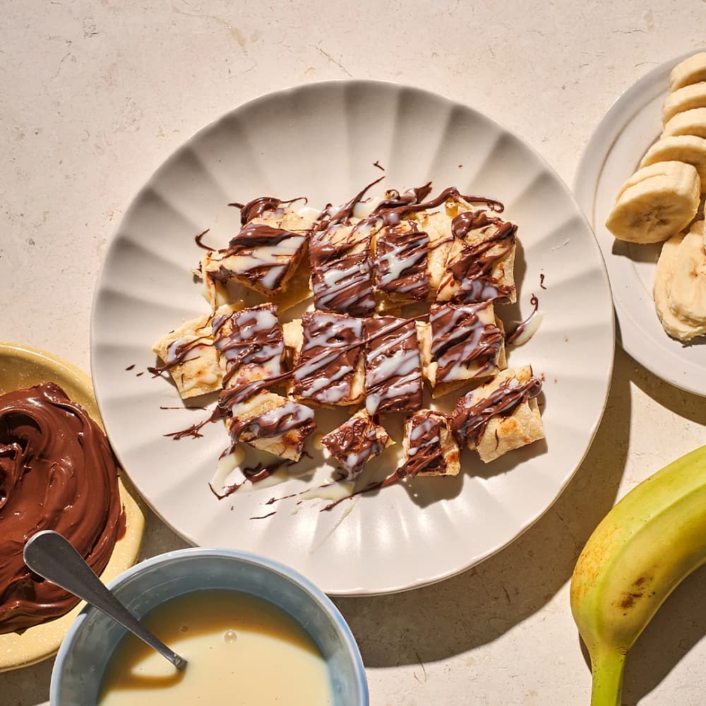 Glutenfria pannkakor med jordnötskolasås och karamelliserad banan