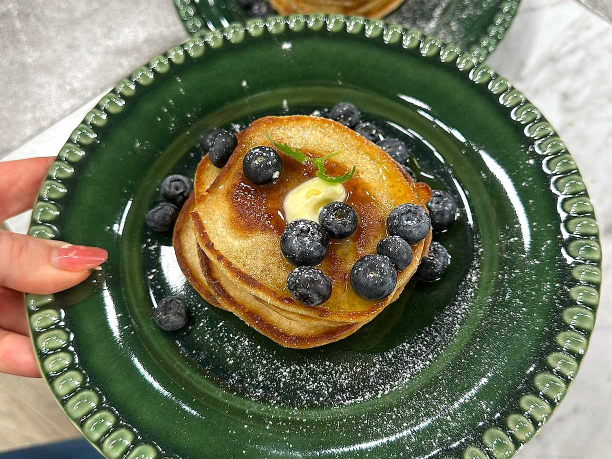 Proteinrika dinkelpannkakor med hallon och blåbär