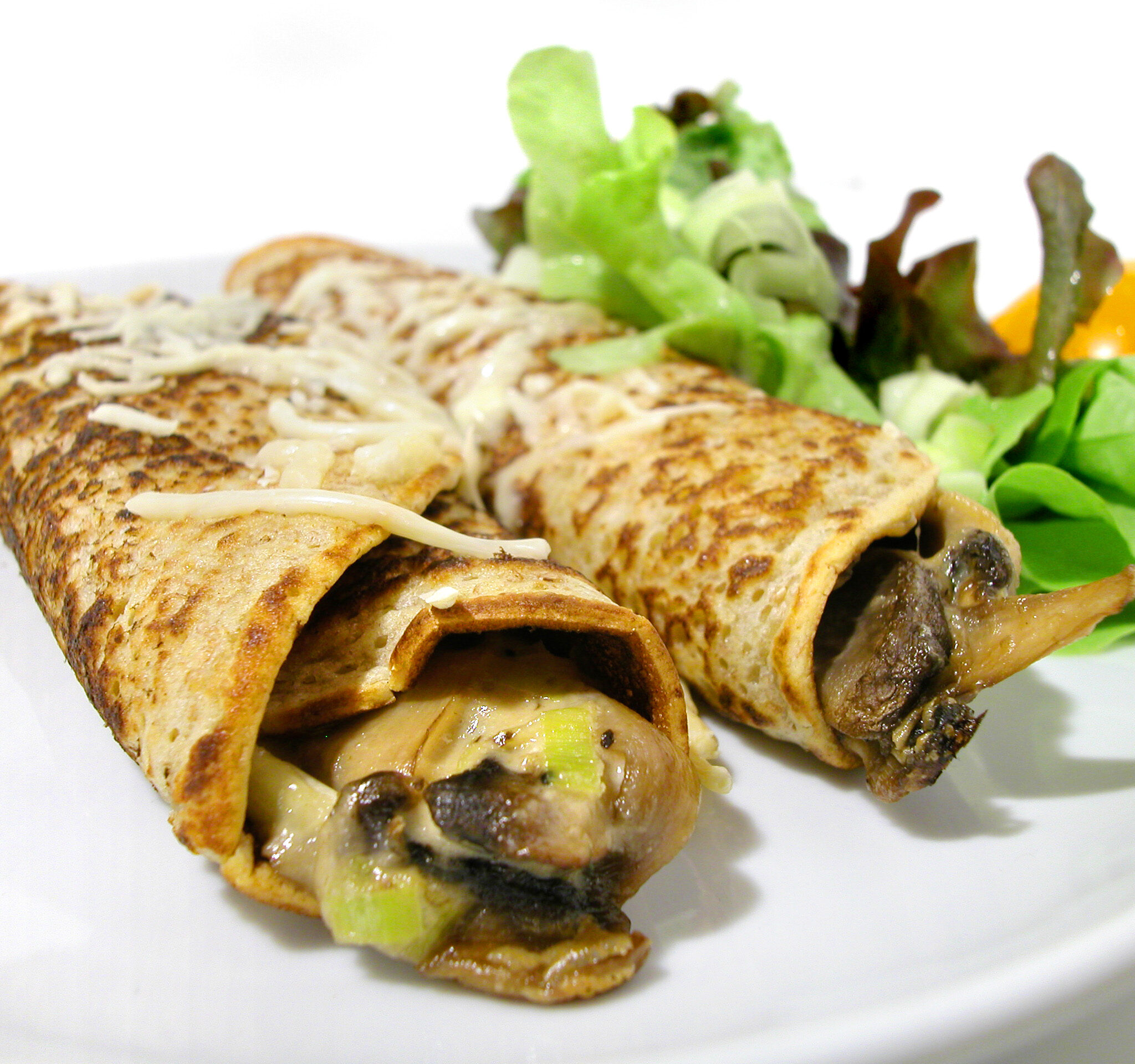 Gratinerade crêpes med svamp och linssallad