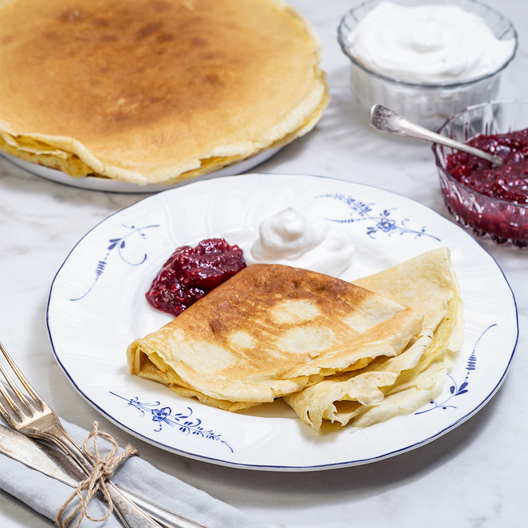 Pannkaksröra med keso och jordgubbssylt