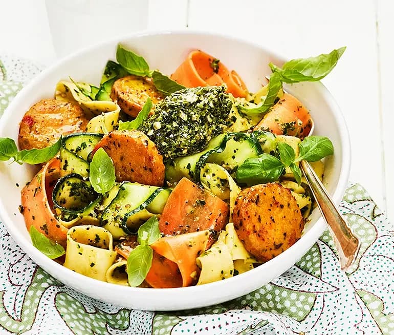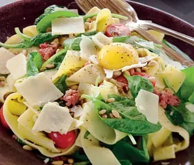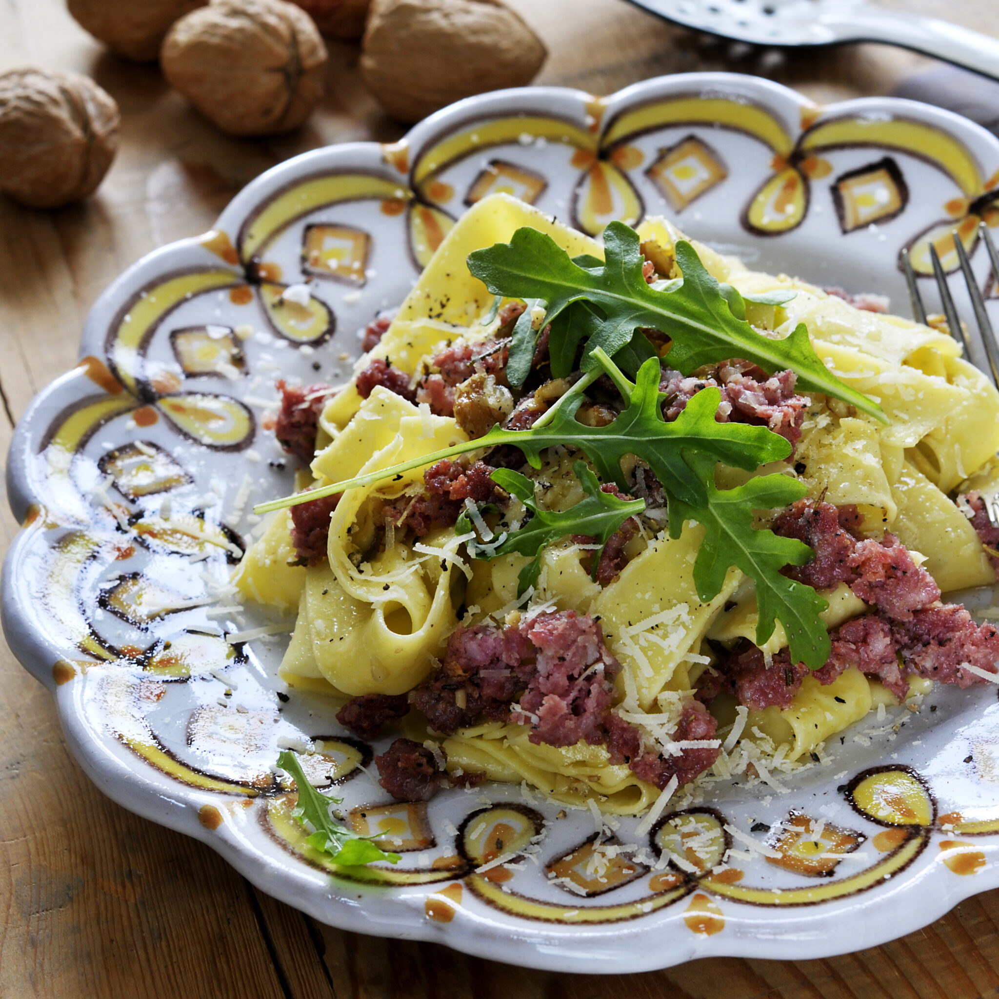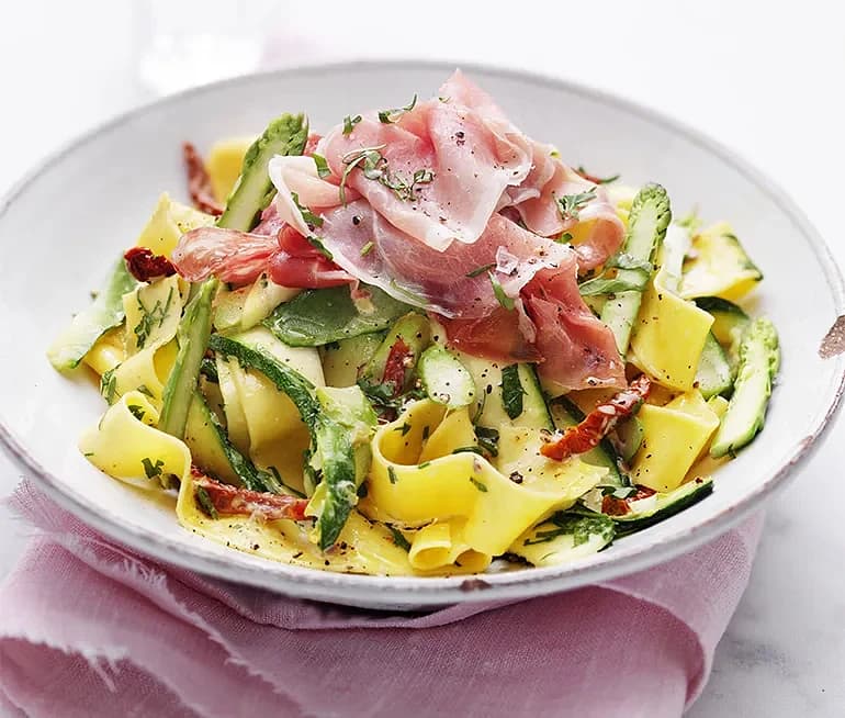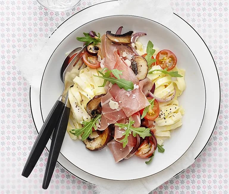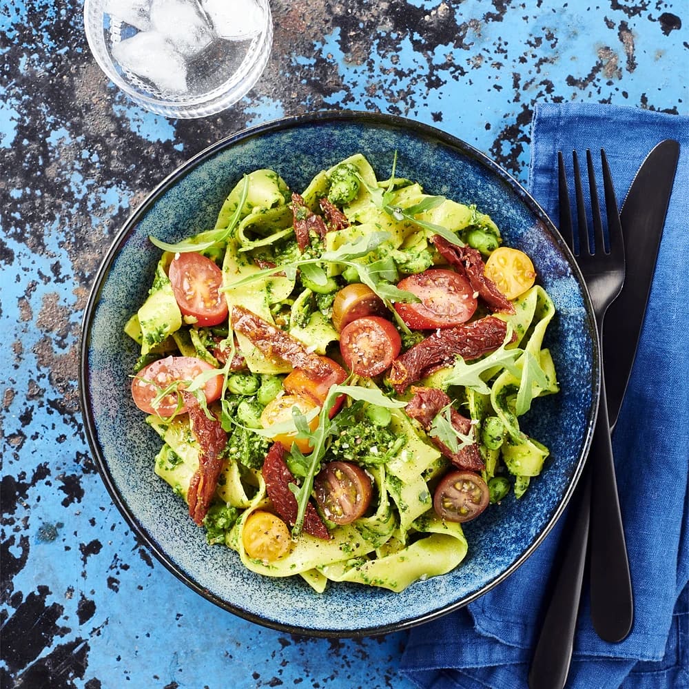 Pappardelle med röd pesto, parmaskinka, rucola och fetaost