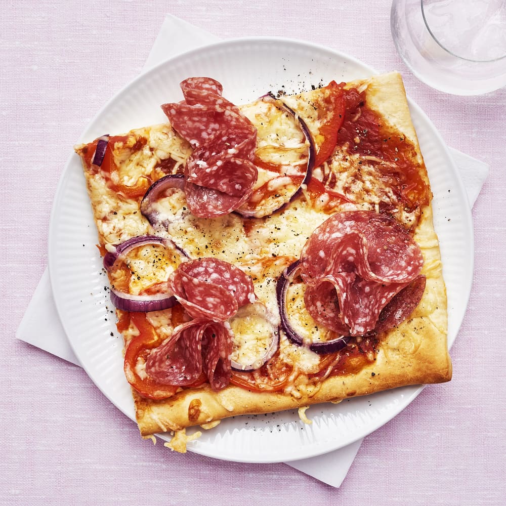 Pizza med salami och paprika