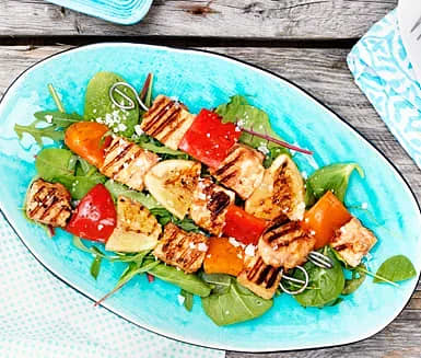 Kycklingspett med grillad paprika- och fetaostdipp och örtig potatissallad