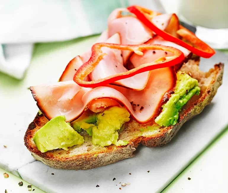 Surdegsmacka med avokado, skinka och paprika