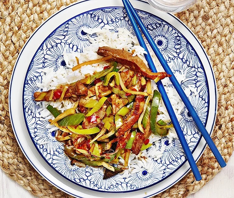 Fläskwok med paprika, bambuskott och ris