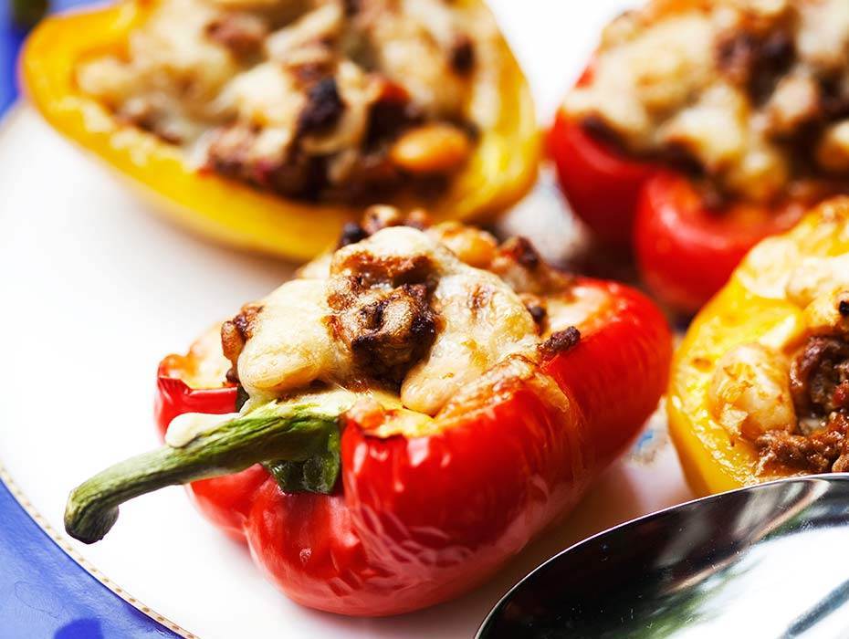 Ugnsgratinerade paprikor med vegetarisk färs