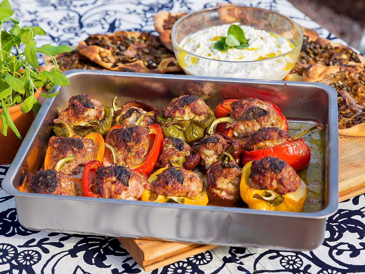 Lammfärsfyllda paprikor med tzatziki på äpple och rotselleri