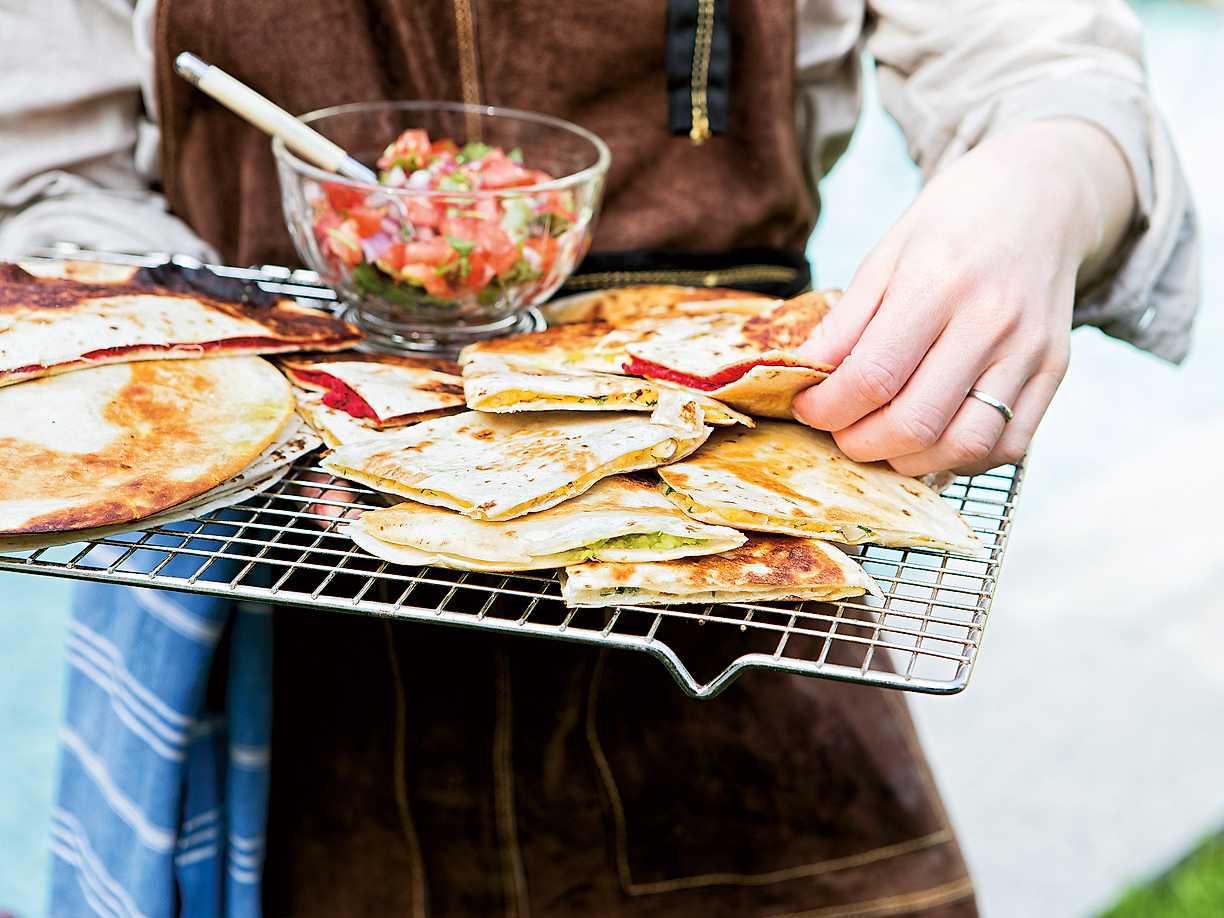 Quesadillas med inlagd rödlök, hummus, kokosbacon eller paprikaröra