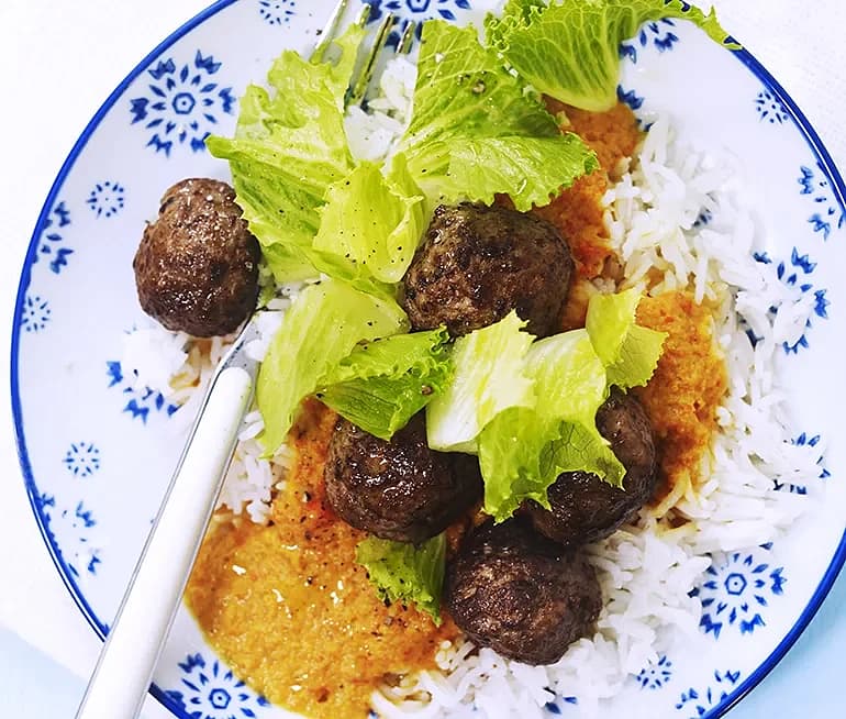Lammfärsbullar i tomat- och paprikasås med saffran
