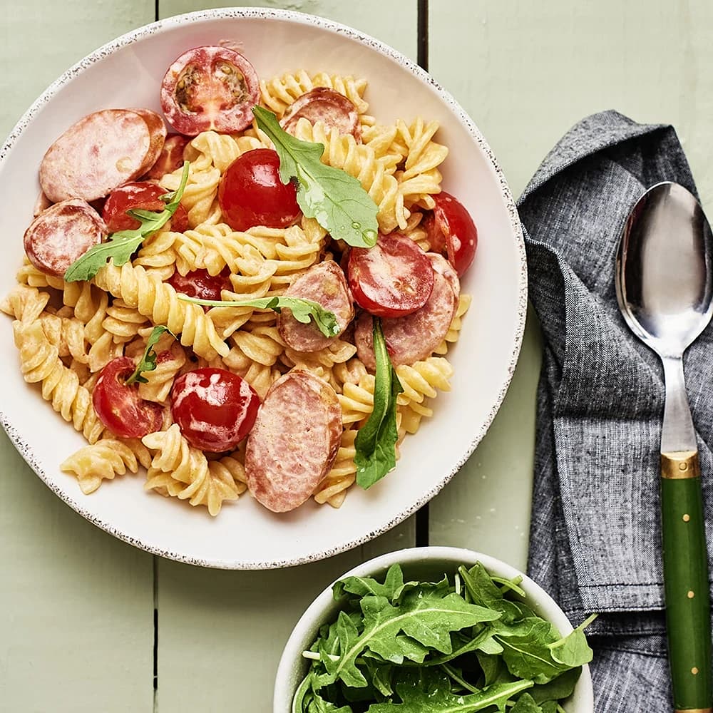 Fusilli och kryddkorv i paprikasås
