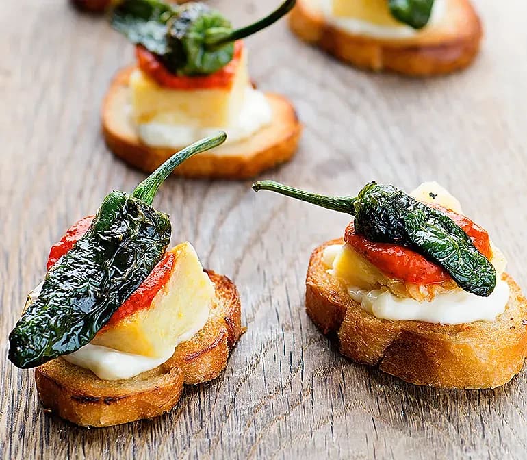 Ostpintxos med paprikasås och padrones