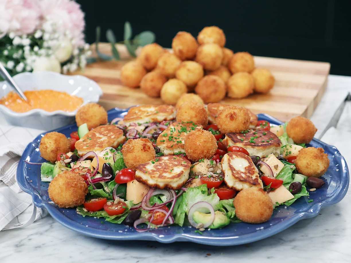 Halloumisallad med vitlökskroketter och rökig paprikasås