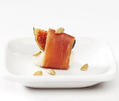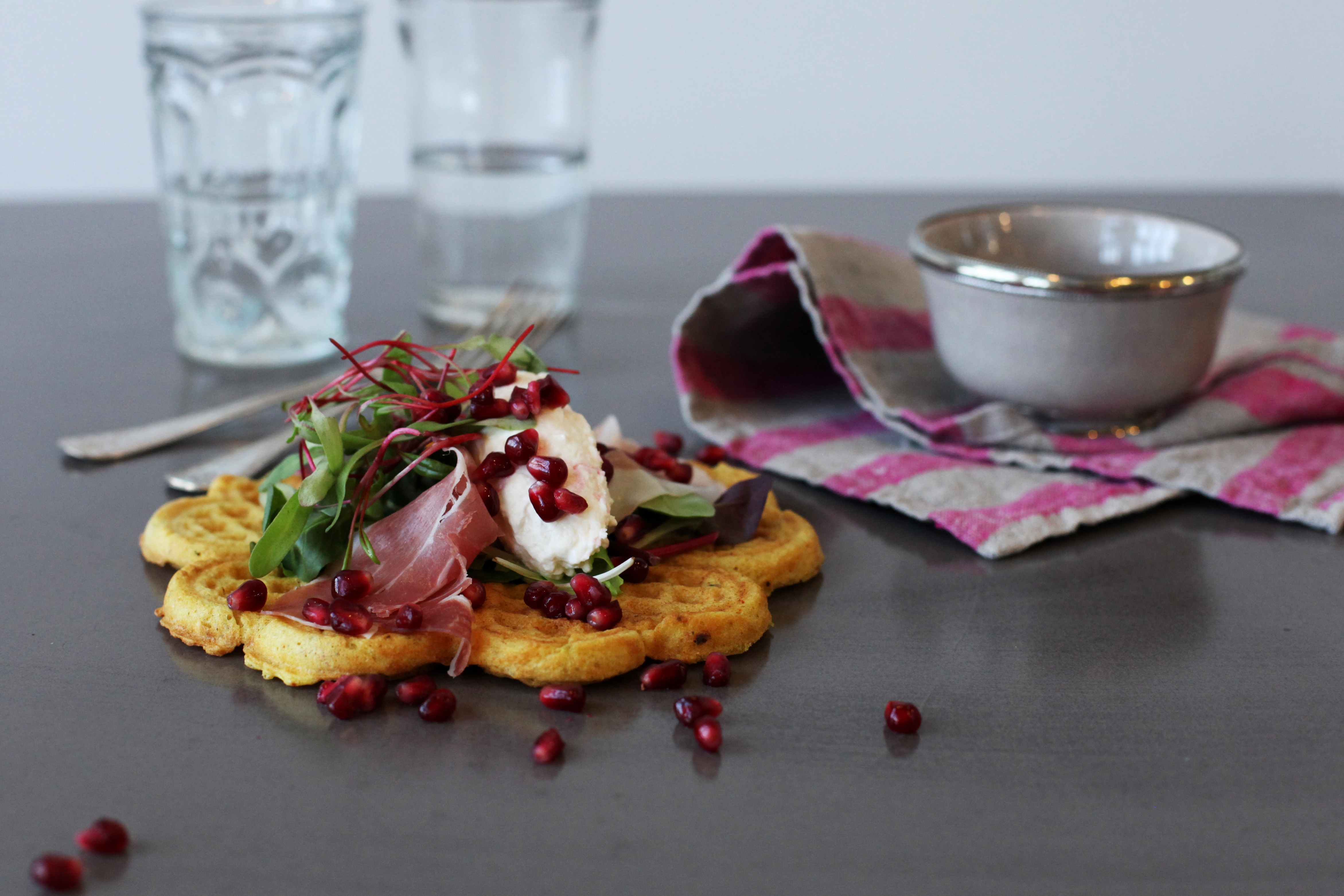 Curryvåfflor med getostcrème, parmaskinka och granatäpple
