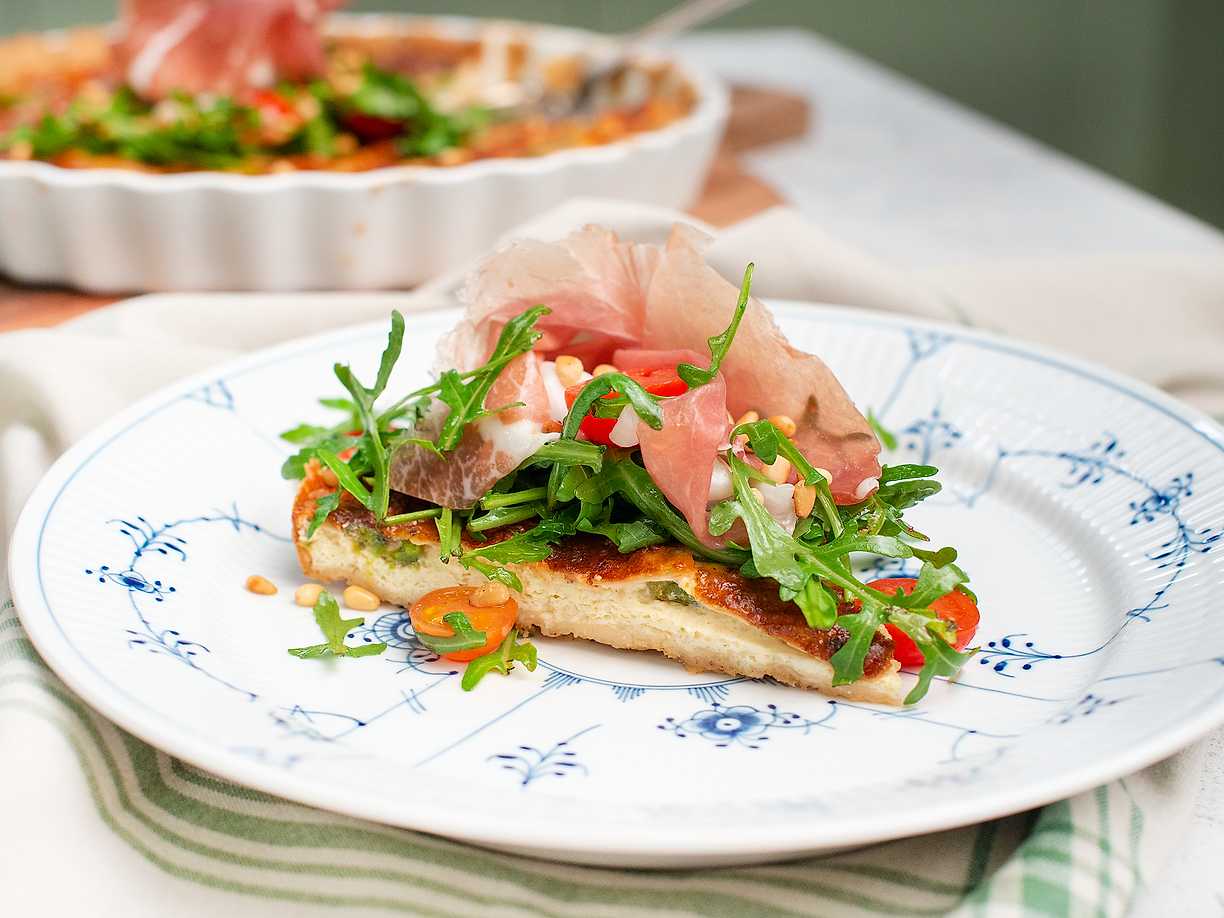 Zucchini- och fetaostpudding med salami och parmaskinka