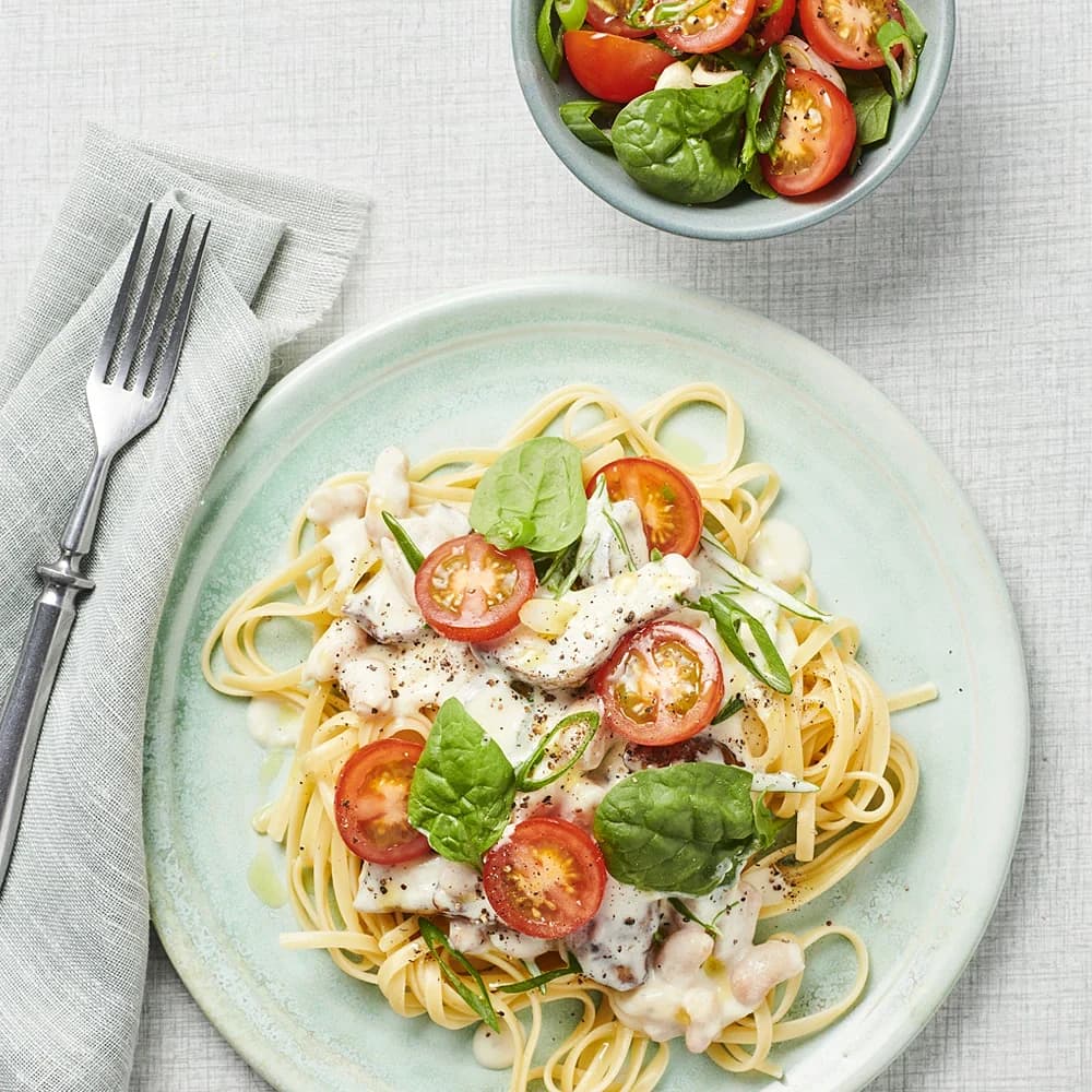 Pasta med kalkonbacon, jordärtskocka och parmesan