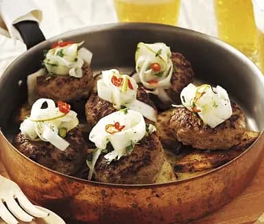 Vegetariska kroppkakor med brynt smör, päron och varm kålsallad