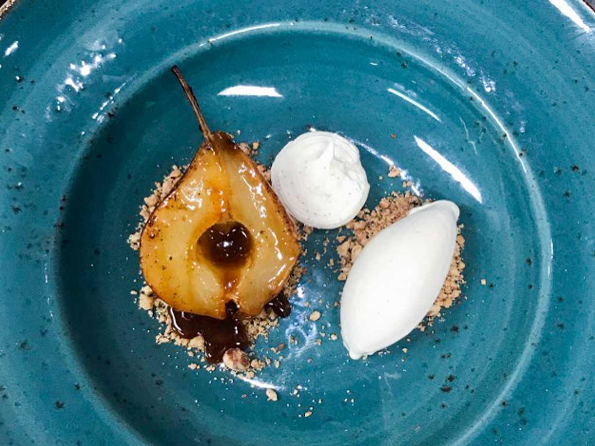 Rådjurssadel med potatispuré, stekta päron och rödvinssås