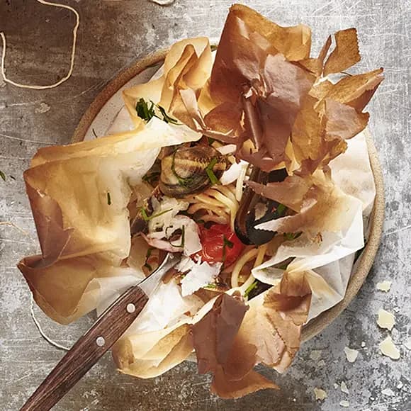 Spaghetti i paket med musslor och räkor