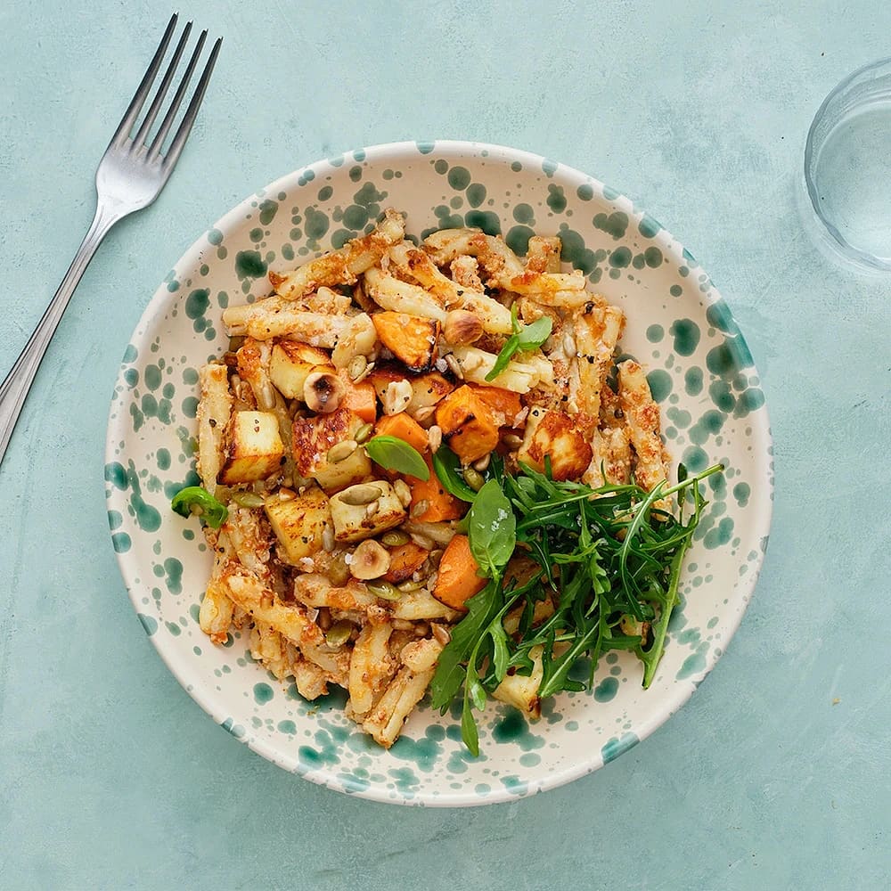 Pasta med sötpotatis, halloumi och röd pesto