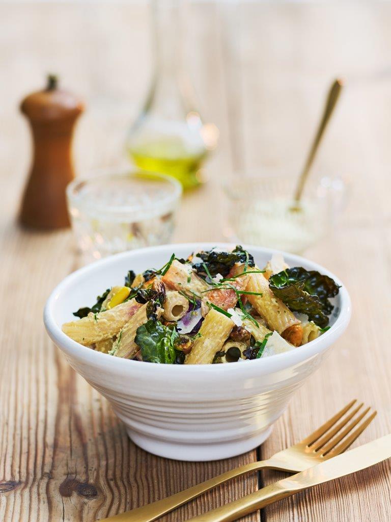 Barilla Tortiglioni med svartkålschips, morötter, rostade nötter med pestodip