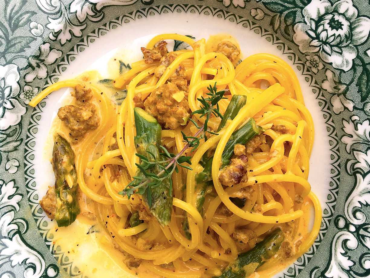 Pasta med salsiccia, sparris och saffran