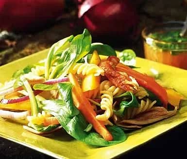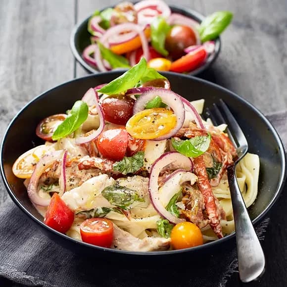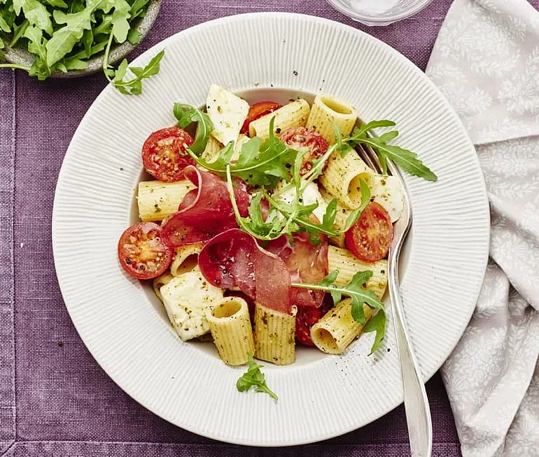 Pappardelle med röd pesto, parmaskinka, rucola och fetaost