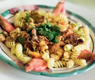 Marinerad pasta med halstrade räkor