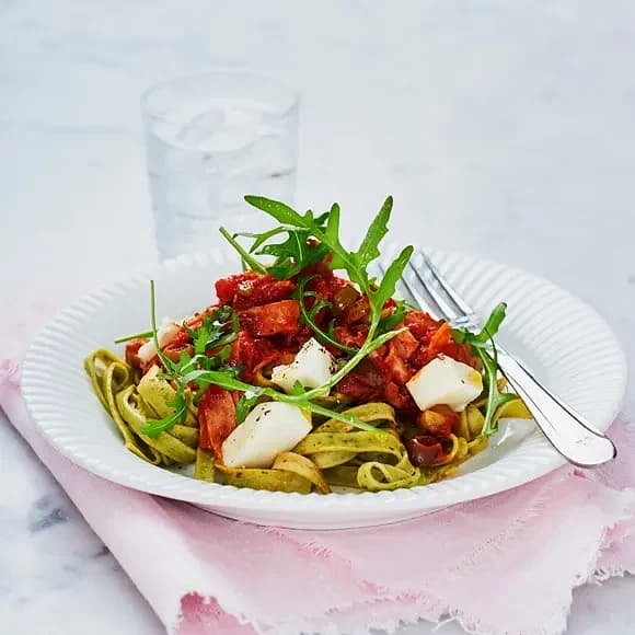 Paprikaslungad pasta med mozzarella och prosciutto cotto