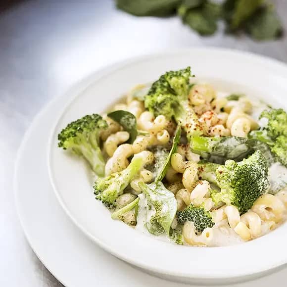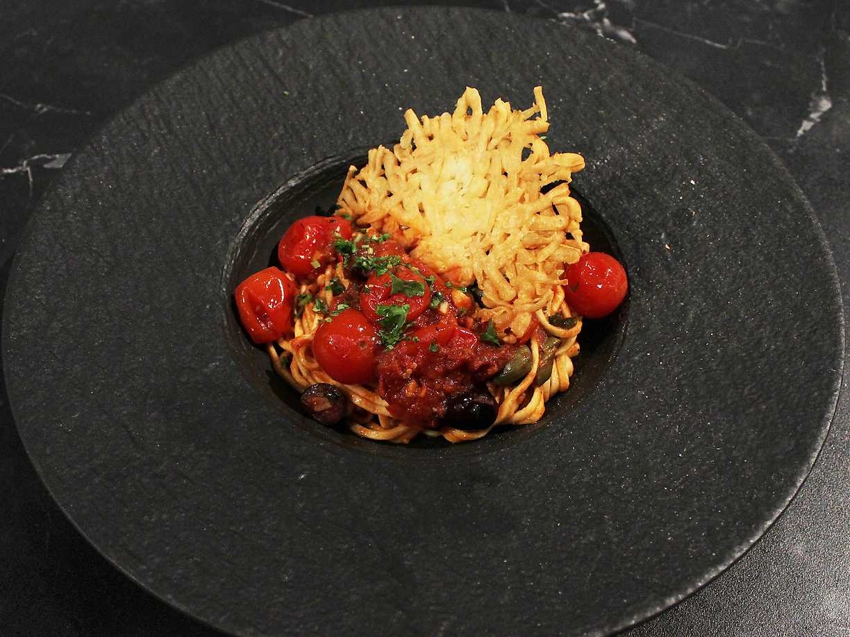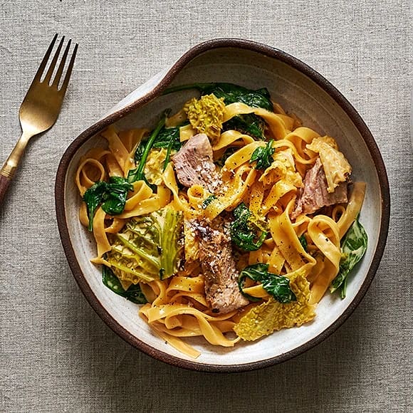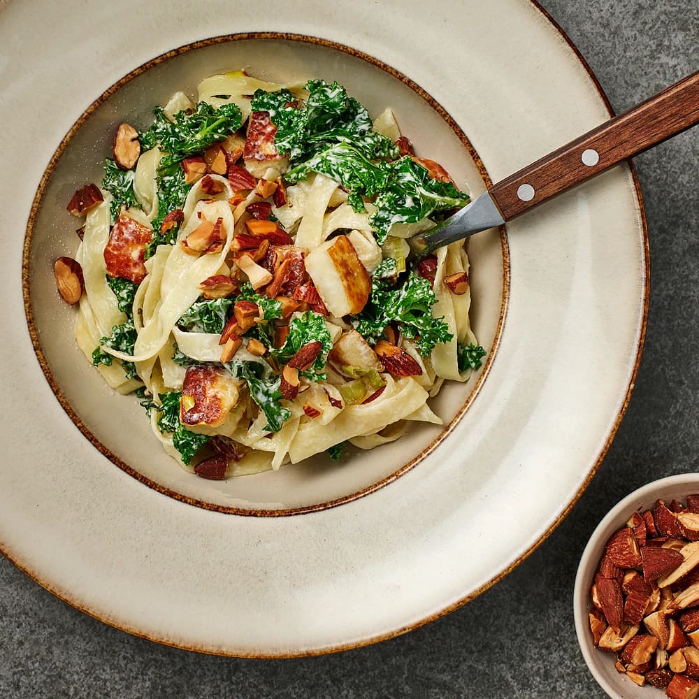 Svartkålspasta med gorgonzola och syrlig tomatsallad